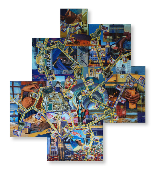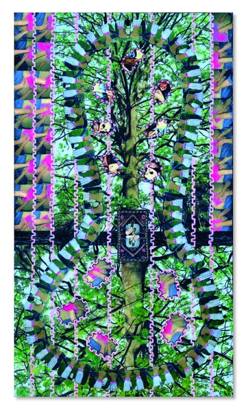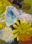 Ina Mayer übermalt und collagiert gefundene Materialien und bringt Fragmente in neue Zusammenhänge, die ornamentalen Charakter haben. Dabei benutzt sie oft Fotosequenzen von Händen, die ubiquitär in ihren Werken auftauchen.